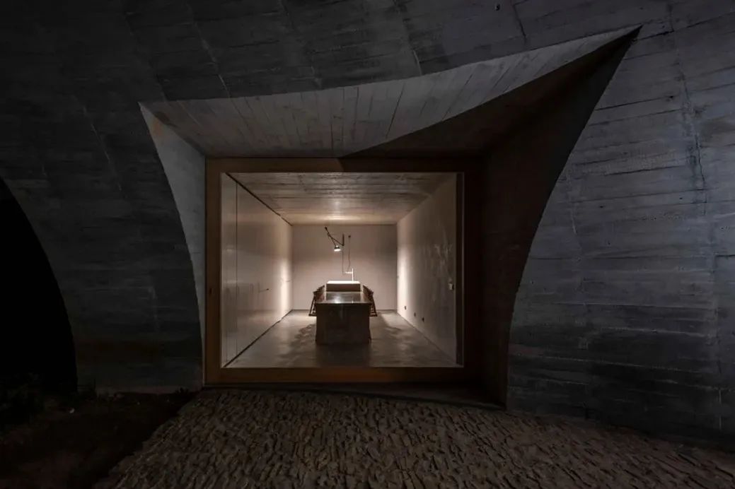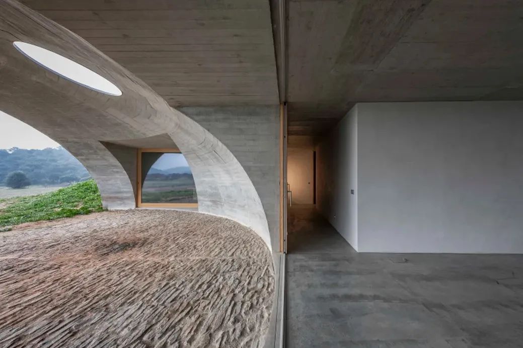 The whole villa is mainly composed of rocks and wood. The opening is designed as a downward concave spherical structure, which perfectly dissolves in the surrounding scene and opens up a unique underground living space.