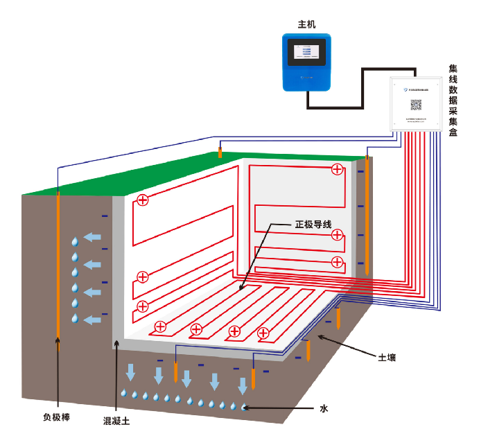The same strong electro osmotic pulse anti-seepage dehumidification system, by installing the positive electrode in the structure and the negative electrode in the outdoor soil layer, applies the electro osmotic pulse charge to make the positive water molecules actively move toward the outdoor negative electrode, effectively ensuring the drying and comfort of the basement.