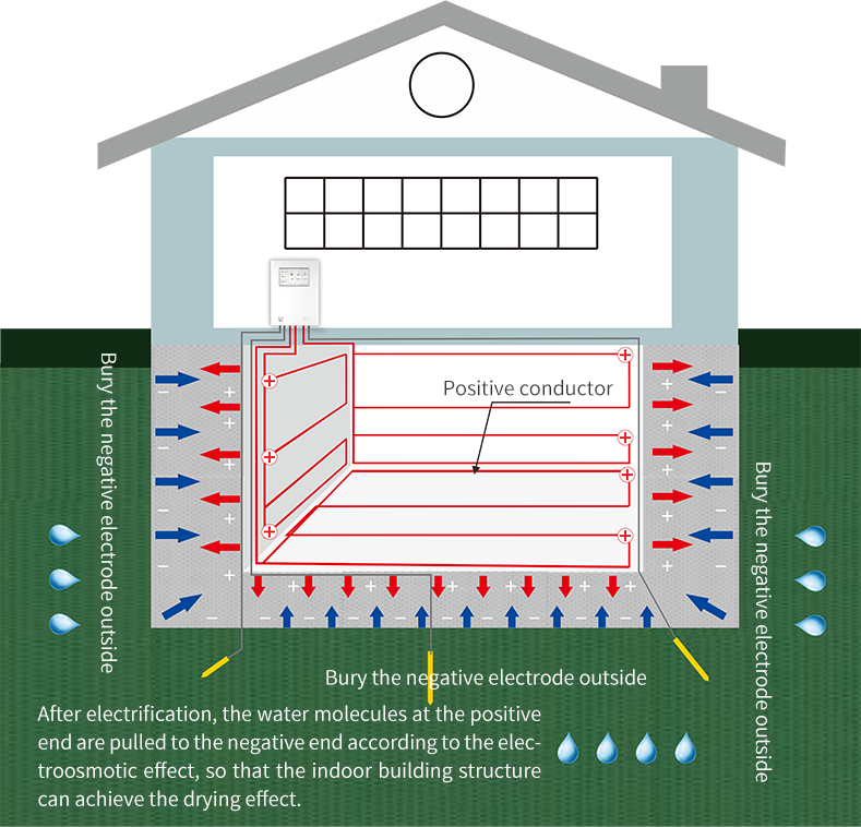 Electroosmotic pulse impermeability and dehumidification technology subverts the traditional impermeability and dehumidification technology, turns passive to active, uses electroosmotic pulse technology to guide the flow of water molecules, excludes the water molecules in the pores in the concrete or brick wall from the structure, adjusts the humidity of the building structure, keeps the wall dry for a long time, but does not crack due to excessive water loss, and truly realizes all-weather protection. Good for moisture-proof basement.